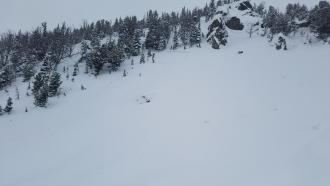 From email: "Went out in Middle Basin north of Big Sky today and saw 5 separate slides, the largest about 500ft across and approximately 2ft deep. All of them were northeast to southeast aspects from about 9200 to 9800ft. The included photos aren't the best but give an idea of the slides, most are from that largest slide." Photo: B. Richards