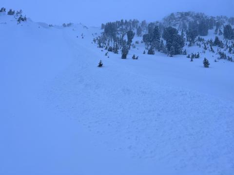 Cooke City, 2022-02-19 This is the slope that avalanched and killed a snow bike rider (motorized) on 2/19/22. Photo is from the Search and Rescue team who were leaving the site as it was getting dark, and did not have time to gather more info. Click link below for more details. Photo: B. Zavora |