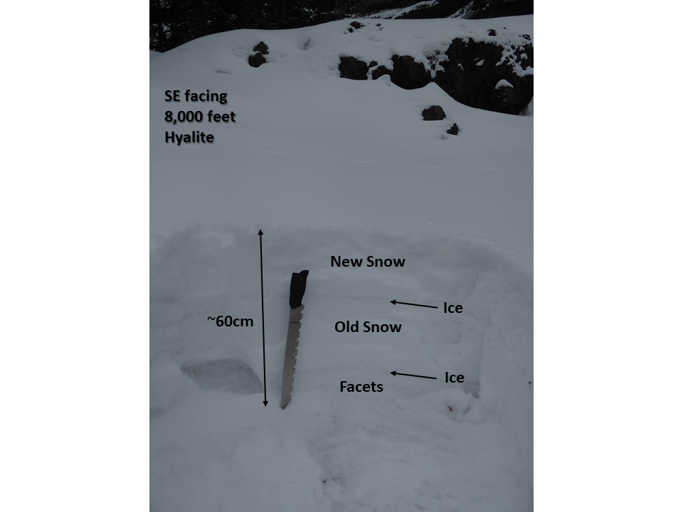 This pit was dug in Hyalite Canyon near Twin Falls. It showed 2 mm facets (sugar snow) underlying the snowpack. This layer did not break in stability tests, but anticipate these grains will get weaker with time. Photo: GNFAC