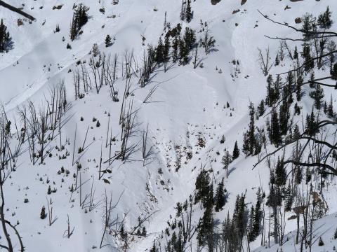 Southern Madison, 2022-03-06 Large wet slabs happened in Cabin Creek on 3/3 or 3/4/22. Photo: T. Sizemore Link to Avalanche Details |