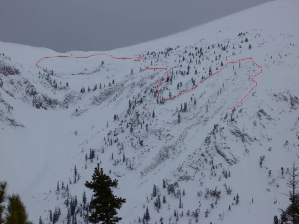 A fast and heavy load produced large avalnaches in the northern Bridgers. This slide broke 3-5 feet deep and more 1,000 feet across - it ran full track, 1,700 vertical. It occurred on a W-SW facing slope at 8,700 ft. The weak layer was old facets near the ground. Photo GNFAC