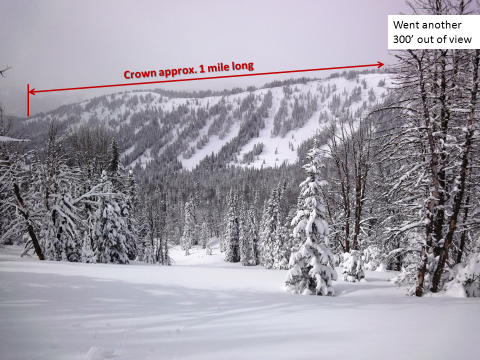This slide occurred on the trail leading to Two Top outside of West Yellowstone. Over two feet of heavy snow has fallen in this area over the past week producing widespread natural and human triggered avalanches. Photo Jim Norlander
