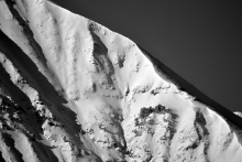 Snow transported by wind on the headwaters of Lone Mountain cross-loads the gullies with drifts. These drifts can be unstable and slide in steep terrain. Photo: B. VandenBos