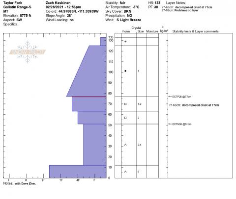 <p>Yesterday near Cabin Creek a snowbiker triggered a large avalanche that broke 3 feet deep on weak snow (<strong><a href="https://www.mtavalanche.com/node/24472">details and photos</a></strong>). Doug and I skied north of Bridger Bowl and found 1-2 foot thick wind slabs that cracked under our skis, and we dug down to see the soft, weak sugary snow buried six feet deep (<strong><a href="https://www.mtavalanche.com/images/21/cracking-wind-slabs">photo</a></s…;, <strong><a href="https://www.youtube.com/watch?v=d_BOYcpqP-I&list=PLXu5151nmAvQDzKmH…;). Dave saw the same poor, untrustworthy snowpack structure in Taylor Fork (<strong><a href="https://www.youtube.com/watch?v=d_BOYcpqP-I&list=PLXu5151nmAvQDzKmH…;). Near Cooke City the weak snow near the ground is less widespread, but some recent avalanche activity has shown weaker snow exists on some slopes with a relatively shallower snowpack (<a href="https://www.mtavalanche.com/node/24432"><strong>details</strong></a> of a natural avalanche in Hayden Creek earlier in the week). Keep these wind slabs and deep slabs in mind, they are possible to trigger even where the snow remains cold and dry today.</p>